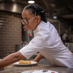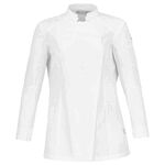Women's short-sleeve jacket featuring a breathable fabric blend and mesh panels. The statement asymmetric front with hidden fastenings gives a functional design a modern and subtle twist. The sportswear-style elasticated centre back provides a comfortable and flexible fit, which is exactly what busy chefs need as they move around the kitchen.